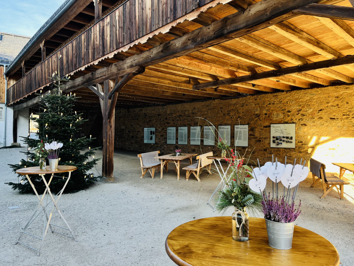 Bei größeren Festen im zum Teil durch die Remise überdachten Innenhof bietet der Gewölbesaal genügend Platz für Buffet oder Getränkeausschank.